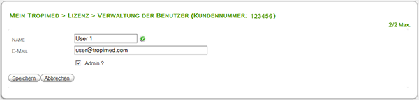 Wenn Ihr Unternehmen über eine Lizenz für einen oder mehrere Benutzer verfügt und Sie den Zugang eines ausscheidenden Mitarbeitenden an dessen Nachfolger übertragen möchten, können Sie die Änderung unter dem Hauptmenüpunkt Optionen > Mein Konto ansehen > Die Benutzer verwalten vornehmen. Dafür müssen Sie Administrator von Tropimed sein.